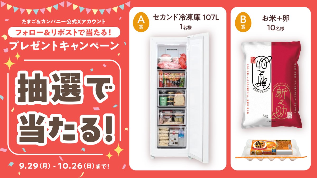 🥚フォロー&リポストで当たる🥚 \プレゼントキャンペーン/ 大人気セカンド冷凍庫や お米5kg・「森のたまご」など豪華景品が 合計11名様に当たるチャンス! 🐣応募方法 ① @tandc_inc をフォロー ②この投稿をリポスト🔁 🐣期間 2025/10/26㈰まで