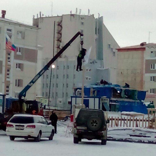 В Норильске краном манипулятором за шкирку подняли рабочего, чтобы он установил на палку флаг. Доброе утро! #норильск #манипулятор #авто
