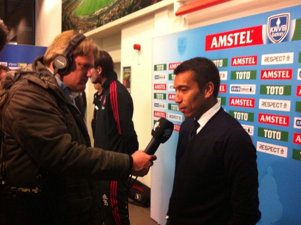 Van Bronckhorst praat na met @JanDirkStouten, die zijn stem kwijt is door ons verslag van de goal in blessuretijd!