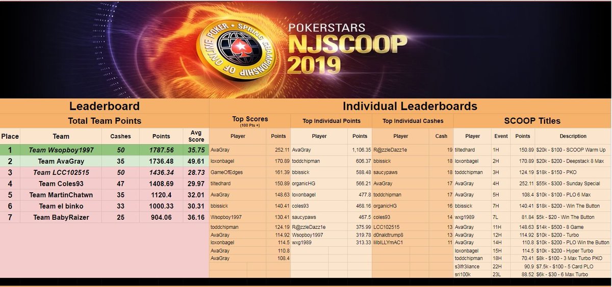 #NJSCOOPcompetition 5-13 No change in top 3 but solid results for the field including two titles! @GameofEdges takes 2nd in 21H-Sunday Special for a huge score! @TheGardenNJ w 6 cashes on the day Titles: 22H-$7.5k 5 Card PLO - s3lfr3liance 23L-$6k 6 Max Turbo - @sri50k congrats!