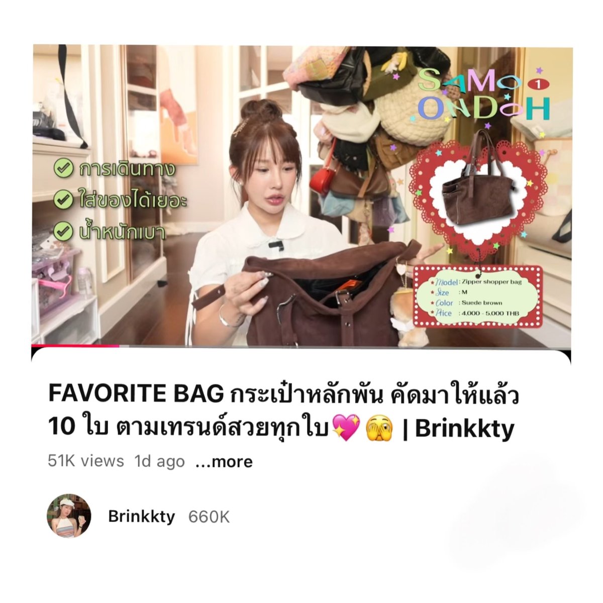 นั่งดูคลิป favorite bag ของคุณบริ๊งค์ กระเป๋า samo ondoh ใบนี้ได้ 100คะแนนเต็มเลยย 🤎✨ จุของได้เยอะ น้ำหนักเบา มีซิปปรับขนาดได้ ✳︎ มาพรีกันได้นะคะ ใบละ 4,390.- free ems ส่งกลับแอร์
