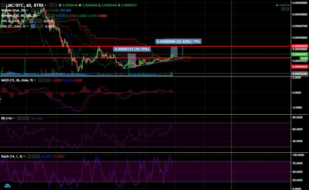 lomocoin looking good just broke out of ascending triangle and nearing the top of the cloud if it breaks above the cloud it will moon!! Lomocoin is severely undervalued. TK cross on 3 hour chart and macd looking good as well. Strong confidence in the market lets go! #lomocoin