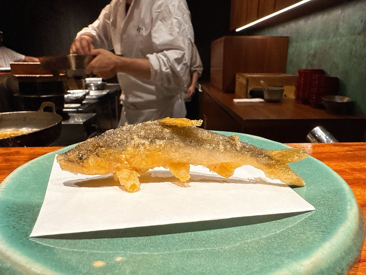 人形町で天ぷら。予約時間を1時間早く間違えるという失態を犯したので近くのワインバーで3杯飲んでから臨んだら酔っ払った。鮎はこれくらいの若いやつの方が天ぷらには美味しい。