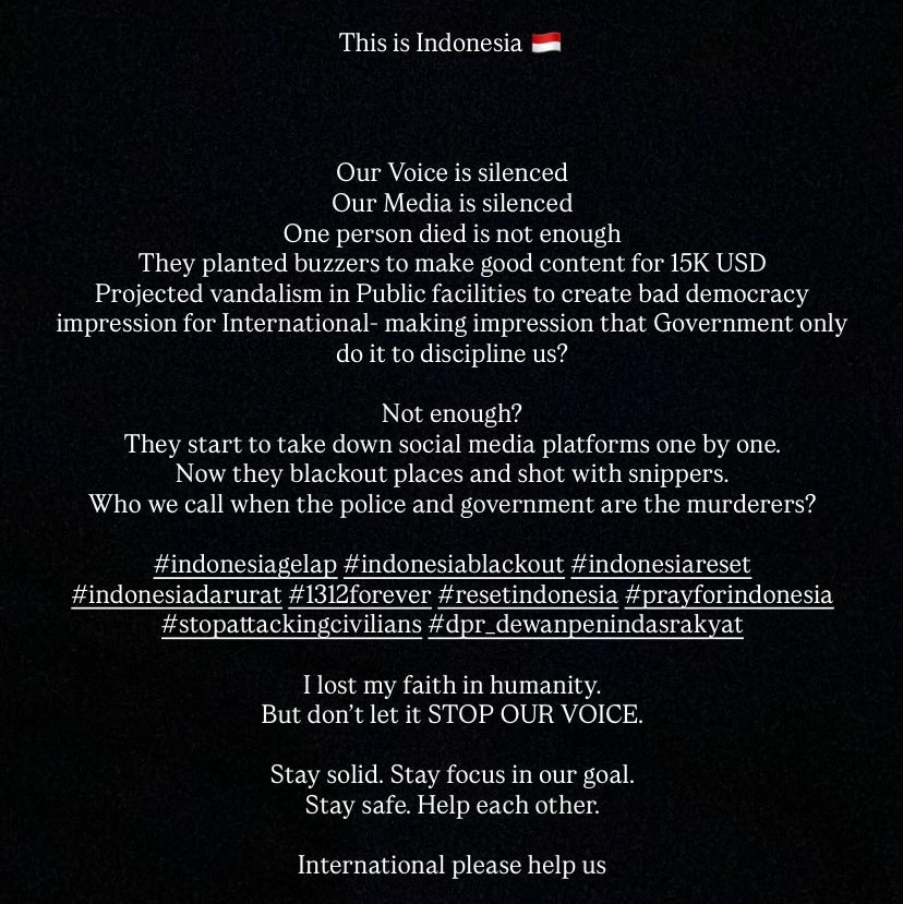🚨 INDONESIA NEED YOUR HELP 🚨 Our Voice is silenced Our Media is silenced Who we call when the police and government are the murderers? #IndonesiaGelap #PrayForIndonesia