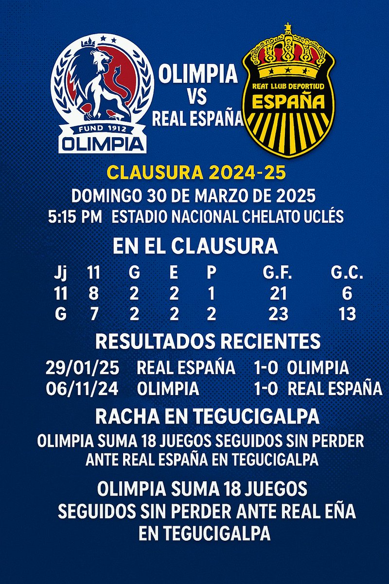 🚨¡Atención afición latina en EEUU! 🇺🇸 🦁⚔️🚂 Olimpia vs Real España 📍 Chelato Uclés ⏰ 5:15 PM (Honduras) 🇺🇸 7:15 PM ET | 6:15 CT | 4:15 PT Olimpia lleva 🔥18 juegos sin perder en casa ante la Máquina Real España gano en la 1ra vuelta. En vivo por @FOXDeportes