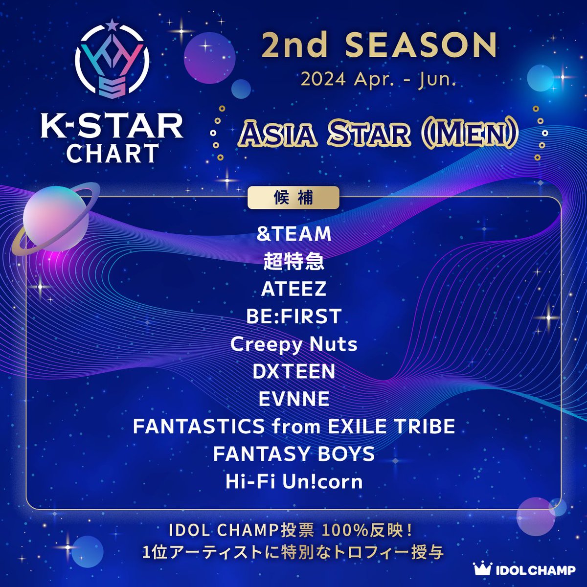 K-STAR CHART 「2nd Season 投票」 💫Asia Star (Men)💫 #andTEAM #超特急 #ATEEZ #BEFIRST #CreepyNuts #DXTEEN #EVNNE #FANTASTICS #FANTASYBOYS #HiFiUnicorn 🗳me2.do/xk1VmwS1