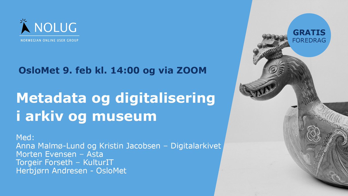 Vi prater om metadata og søkeportaler for arkiv og museum på OsloMet i morgen, torsdag 9. februar. Kom og bli med, eller strøm på Zoom. Lenker for strømming og påmelding finner du på nolug.no/metadata-og-di….