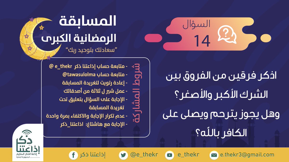 مسابقة #سعادتك_بتوحيد_ربك #السؤال_الرابع_عشر نأمل من المشاركين تطبيق شروط المسابقة للدخول في السحب رابط الحلقة youtu.be/5ZcA2W8FUkA تابع وشارك @e_thekr @tawasulolma