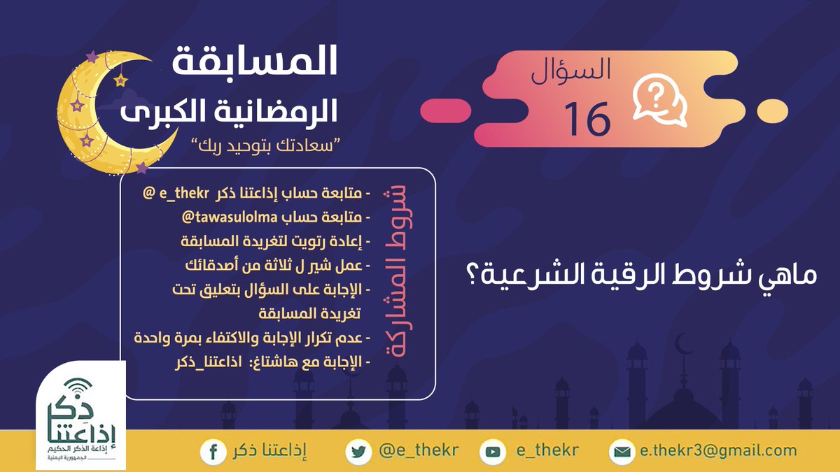 مسابقة #سعادتك_بتوحيد_ربك #السؤال_السادس_عشر نأمل من المشاركين تطبيق شروط المسابقة للدخول في السحب رابط الحلقة youtu.be/MeeEOo-CYbc تابع وشارك @e_thekr @tawasulolma