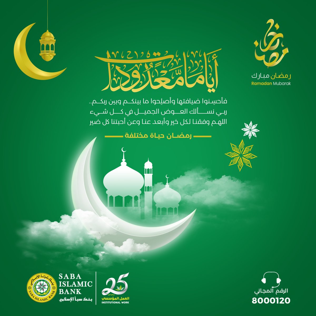 "أياماً معدودات" فأحسِنوا ضيافتها وأصلِحوا ما بينكم وبين ربكم.. ربي أسئلك العوض الجميل في كل شيء ... اللهم وفقنا لكل خير وأبعد عنا وعن أحبتنا كل ضير... 🌙رمضان حياة مختلفة.. #رمضان_كريم #بنك_سبأ_الإسلامي #ثقة_وأمان