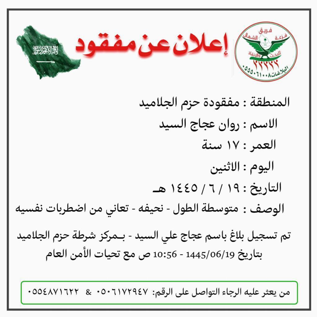 #فريق_فزعة_الشمال_للبحث_والانقاذ #حائل ورد بلاغ لغرفة عمليات فريق فزعة الشمال عن مفقودة ب #حزم_الجلاميد والمعلومات بكرت البلاغ