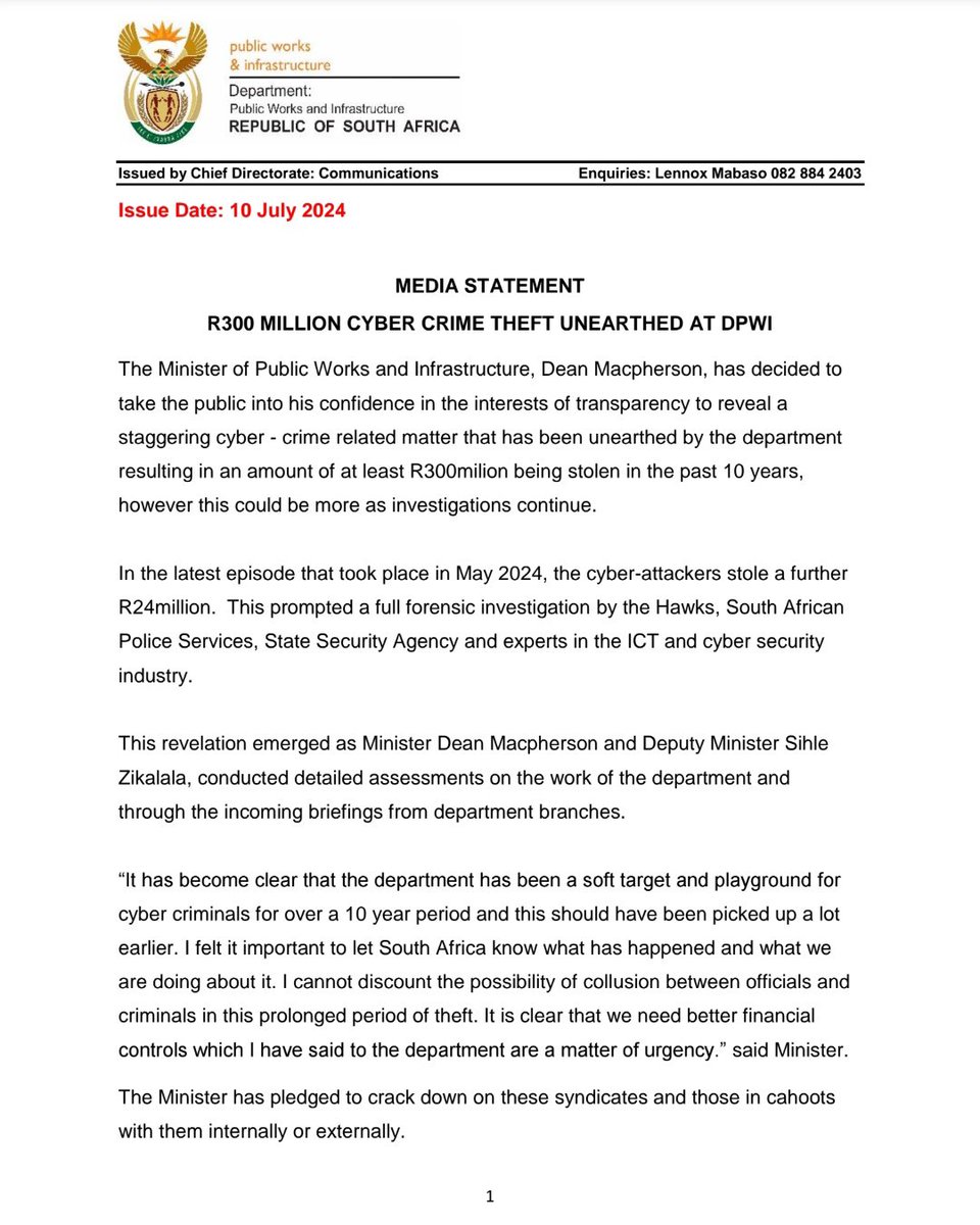 I have decided to take the public into confidence and advise South Africa that at least R300 million has been stolen from the department in the last 10 years in an elaborate scheme by cyber-hackers, and potentially officials within the department. It is unthinkable that this has…