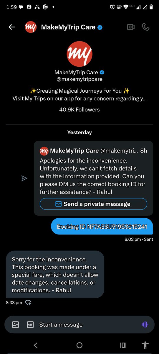 @jagograhakjago @RamMNK @Ministry_CA @MoCA_GoI Kindly help @makemytrip is cheating customers by denying date change quoting special fare. Also this booking is not visible on the airlines website too.