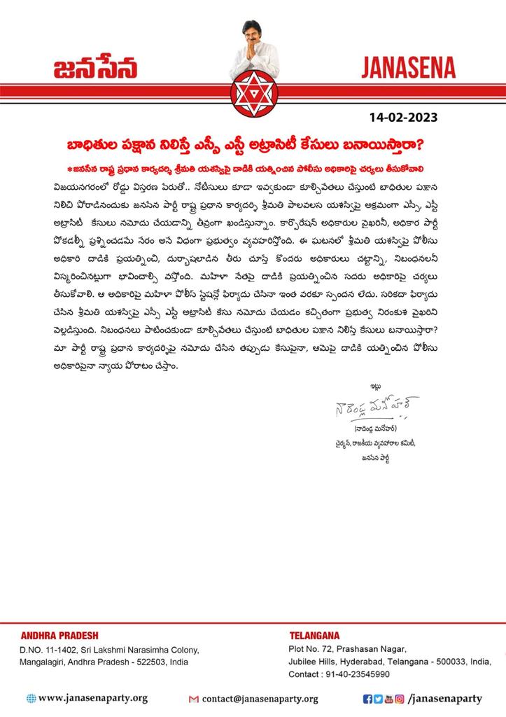 బాధితుల పక్షాన నిలిస్తే ఎస్సీ ఎస్టీ అట్రాసిటీ కేసులు బనాయిస్తారా? •జనసే న రాష్ట్ర ప్రధాన కార్యదర్శి శ్రీమతి యశస్విపై దాడికి యత్నించిన పోలీసు అధికారిపై చర్యలు తీసుకోవాలి - JanaSena Party PAC Chairman Shri @mnadendla