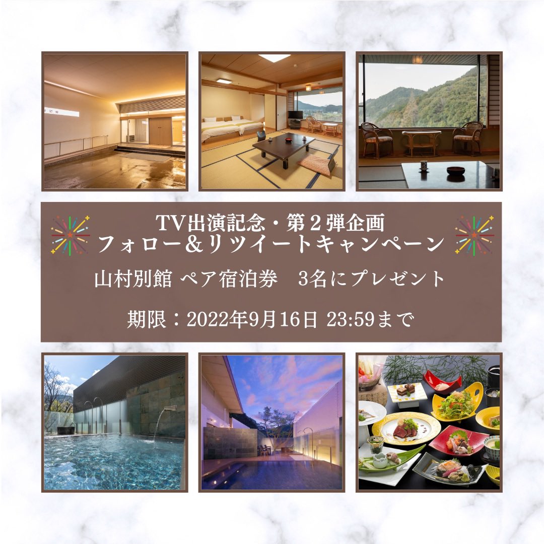 🌈第2弾🌈 TV出演記念 #フォローRT #キャンペーン 山村別館のペア宿泊券を3名の方にプレゼント! ⏰応募締切 9/16(金) 23:59 ⭐応募方法⭐ ①@yamamurabekkanをフォロー ②この投稿をRT #山村別館