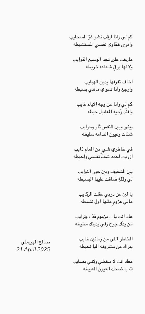 تكابرت الديار وسقت رجلي والعيون اللي تنحّت شرق على مالله ومر درب ٍ سهجته والله ادرى باوّله واتلاه لي مْن اسباب نفس ٍ في خوافيها حديث وليلتين وطرق اغني به ليا من ضاع صوتي في يقين السالفه واعماه يمر الوقت وارقب خطوته وادري بنفسي ما بوجهه فرق وانا ما بينه وما بين قلبٍ لا استعاض…