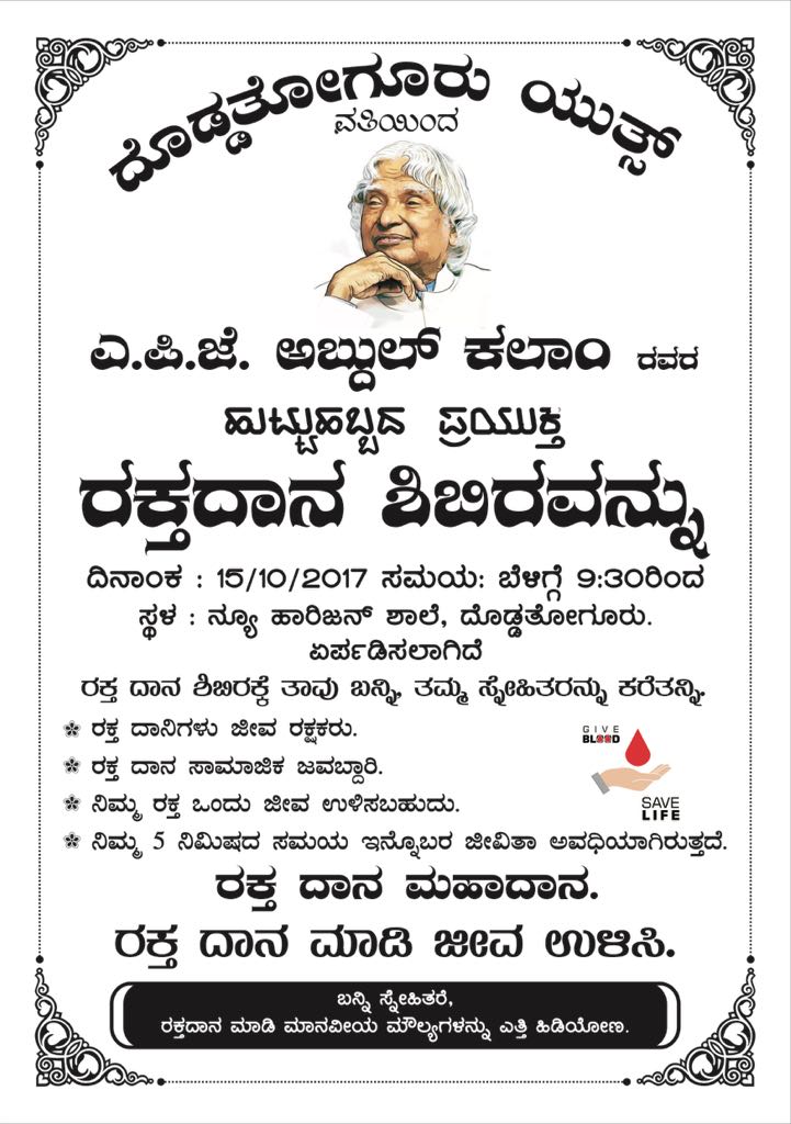 On behalf of Abdul Kalam sir’s Birth Anniversary.. DODDA THOGURU YOUTHS are organising BLOOD CAMP.. Please join hands let’s make it success