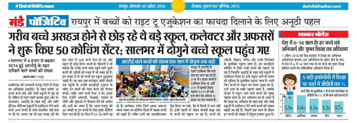 #RTEपारदर्शीरायपुर के अंतर्गत वंचित और गरीब बच्चों को शहर के प्रतिष्ठित स्कूलों में प्रवेश मिला.दैनिक भास्कर ने इस प्रयोग को पूरे देश में सभी भाषाओं हिंदी,गुजराती, मराठी आदि में प्रकाशित करके हमारी पूरी टीम का मनोबल और बढ़ाया.दैनिक भास्कर ग्रुप को हमारी पूरी टीम की ओर से धन्यवाद.