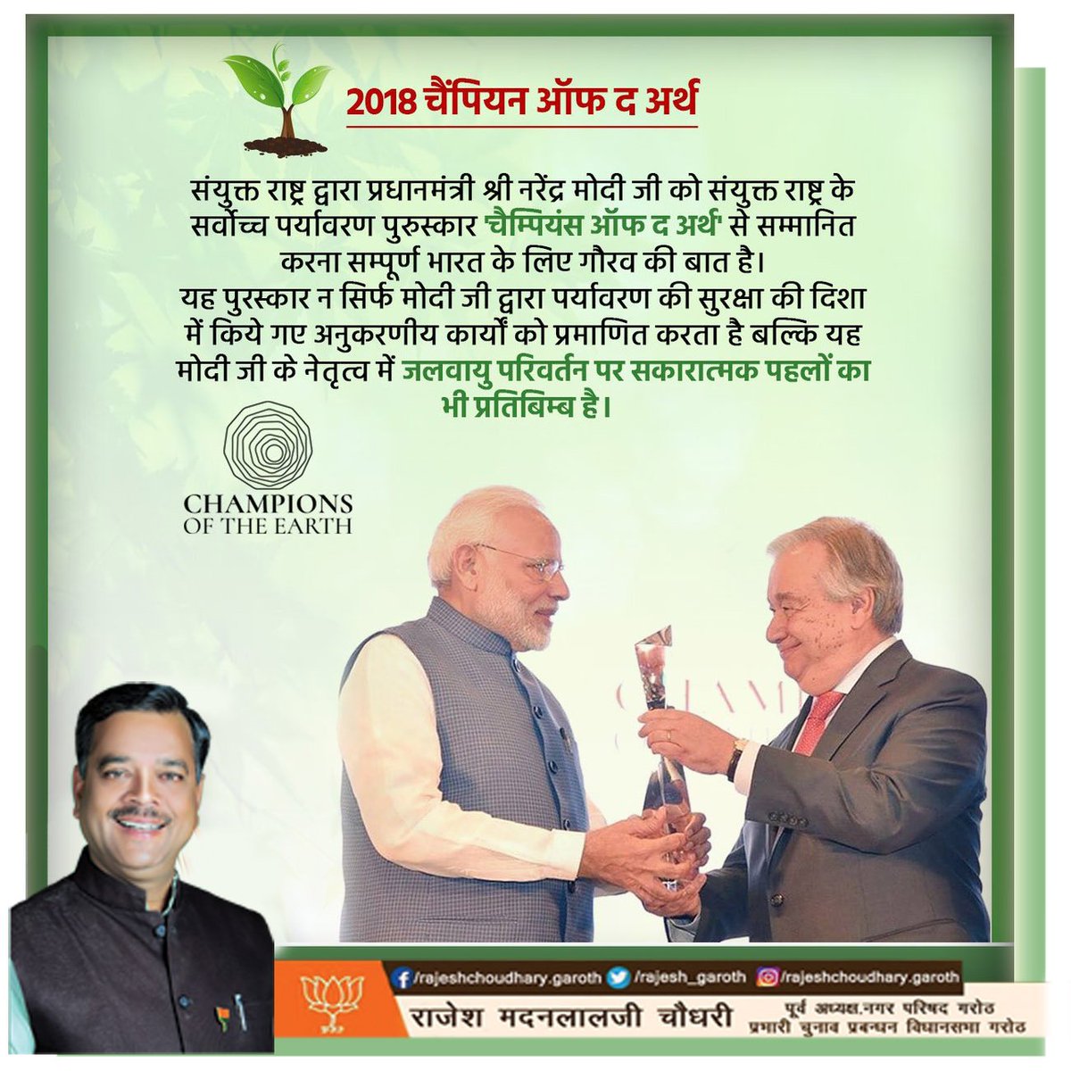 संयुक्त राष्ट्र द्वारा प्रधानमंत्री श्री @narendramodi जी को संयुक्त राष्ट्र के सर्वोच्च पर्यावरण पुरुस्कार 'चैम्पियंस ऑफ द अर्थ' से सम्मानित करना सम्पूर्ण भारत के लिए गौरव की बात है। #ChampionsOfTheEarth