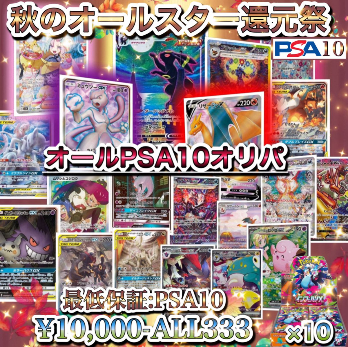 10/4 14:00〜販売開始‼️ 🆕公式いーぶいず7周年記念大還元スペシャルPSA10限定オリパ第3弾㊗️🎊🎉☺️🔥✨✨ ブラッキーVMAX SAPSA10✨✨ ✨スペシャルPSA10パック✨ 『7周年限定還元SP【秋の感謝祭ポケカ🍁スペシャル】オリパ♦️🐈⬛🐈⬛🐈⬛』 ・全口PSA10保証 【1口10,000円】全333口限定…