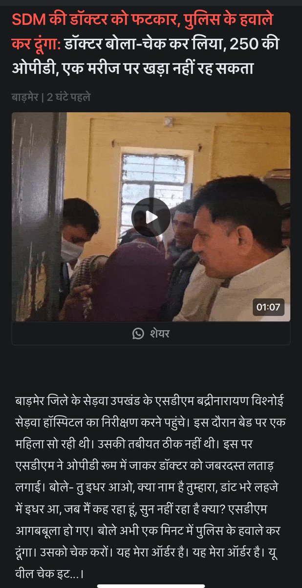 सेड़वा, बाड़मेर, राजस्थान — SDM (बद्रीनारायण) का घोर अन्यायपूर्ण आचरण! सरकारी अस्पताल में डॉक्टर का काम सभी मरीजों को देखना है, न कि किसी एक के पास खड़े रहने का अवैध आदेश मानना! 250 से अधिक OPD मरीजों का इलाज कर रहे डॉक्टर के साथ सार्वजनिक रूप से अभद्रता कर SDM ने…