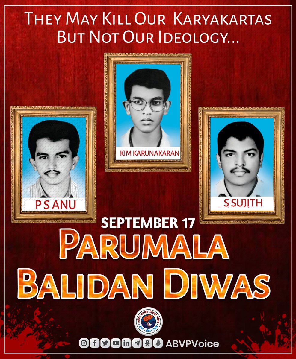 On 17 September 1996, three ABVP karyakartas Anu, Sujit and Kim were killed by communist goons in Parumala, Kerala. Our heartfelt tributes to them. Their supreme sacrifice for the ideology inspires us all to work for Bharat.