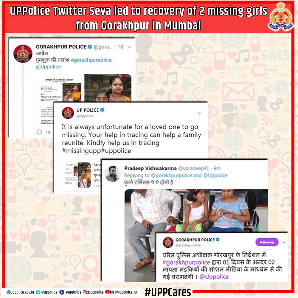 2 girls went missing from Gorakhpur whose pictures were tweeted by @gorakhpurpolice & @Uppolice appealing to trace them We compliment alert citizen Pradeep Vishwakarma who saw them at Kurla terminus Mumbai & responded to the tweet leading to their recovery #SocialMedia #Twitter https://t.co/v0Bln6pSsZ