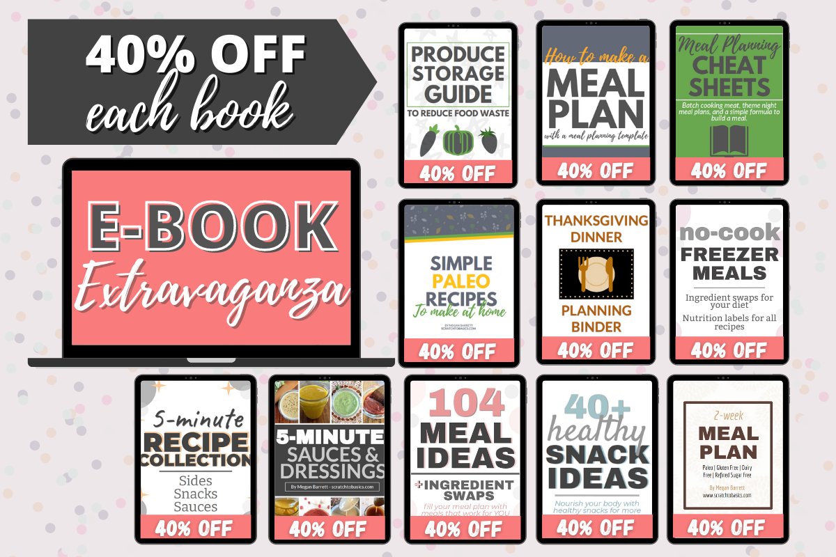 Looking for healthy recipe inspiration? Meal planning help? Or maybe you just love a good deal? You need to check out the E-Book Extravaganza, going on this week only! 40% off all individual E-Books + Bundle & Save! scratchtobasics.com/shop
