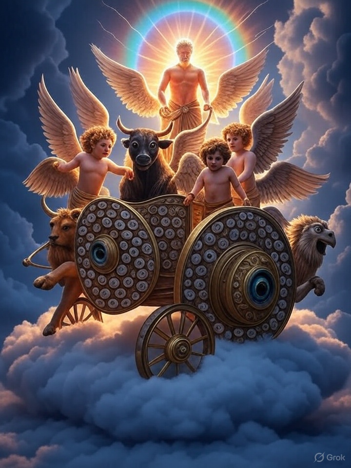 A stormy wind from the north with a great cloud and fire, revealing a divine chariot. Four cherubim with four faces and wings support a crystal expanse and throne. A radiant, haloed figure symbolizes God’s glory and sovereignty in exile.