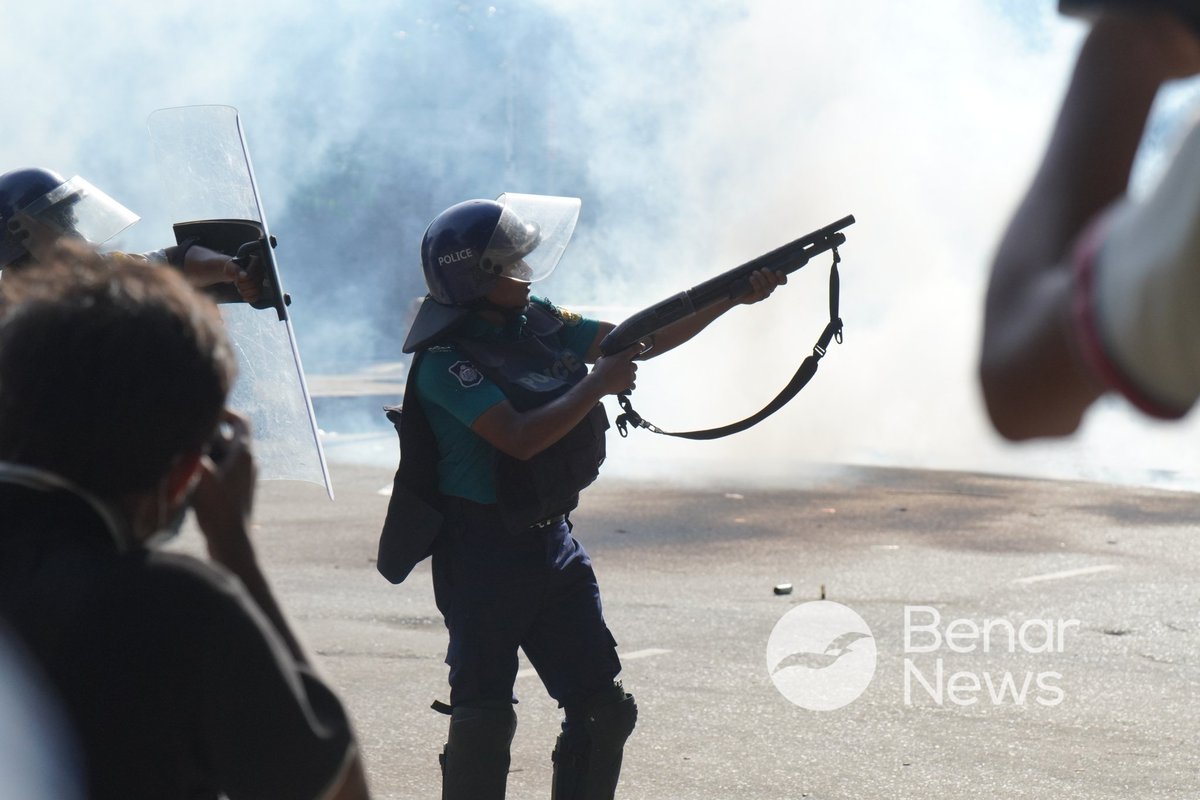 General students at DU performed Gayebana Janaza, or funeral prayers in absentia, on Wednesday afternoon. Following the event, students organized a rally with coffins, which the police broke up. A policeman is pointing a weapon at the students. 17 July. Photo: Sudeepto Salam