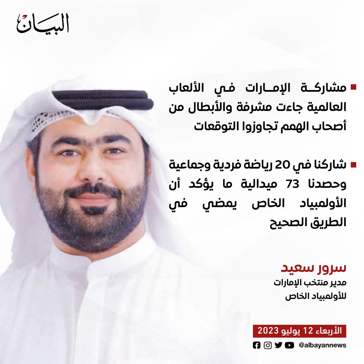سرور سعيد مدير منتخب #الإمارات للأولمبياد الخاص لـ #البيان: • حققنا نتائج مشرفة في دورة الألعاب العالمية #برلين 2023 وحصدنا 73 ميدالية ملونة • المشاركة كانت إيجابية للغاية، وأكدت أن الأولمبياد الخاص يمضي في الطريق الصحيح الحوا كاملاً| albayan.ae/sports/all-gam… #البيان_الرياضي