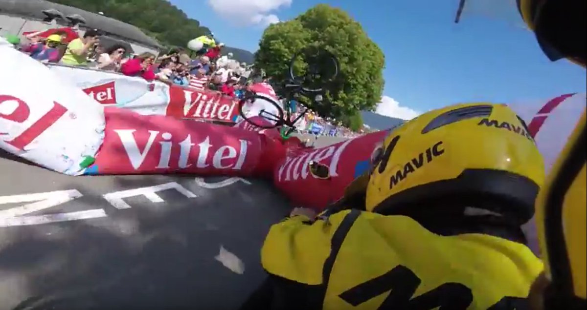 The most bizarre #TDF crash ever: Adam Yates crashes into a deflated flamme rouge! road.cc/196628 #cycling