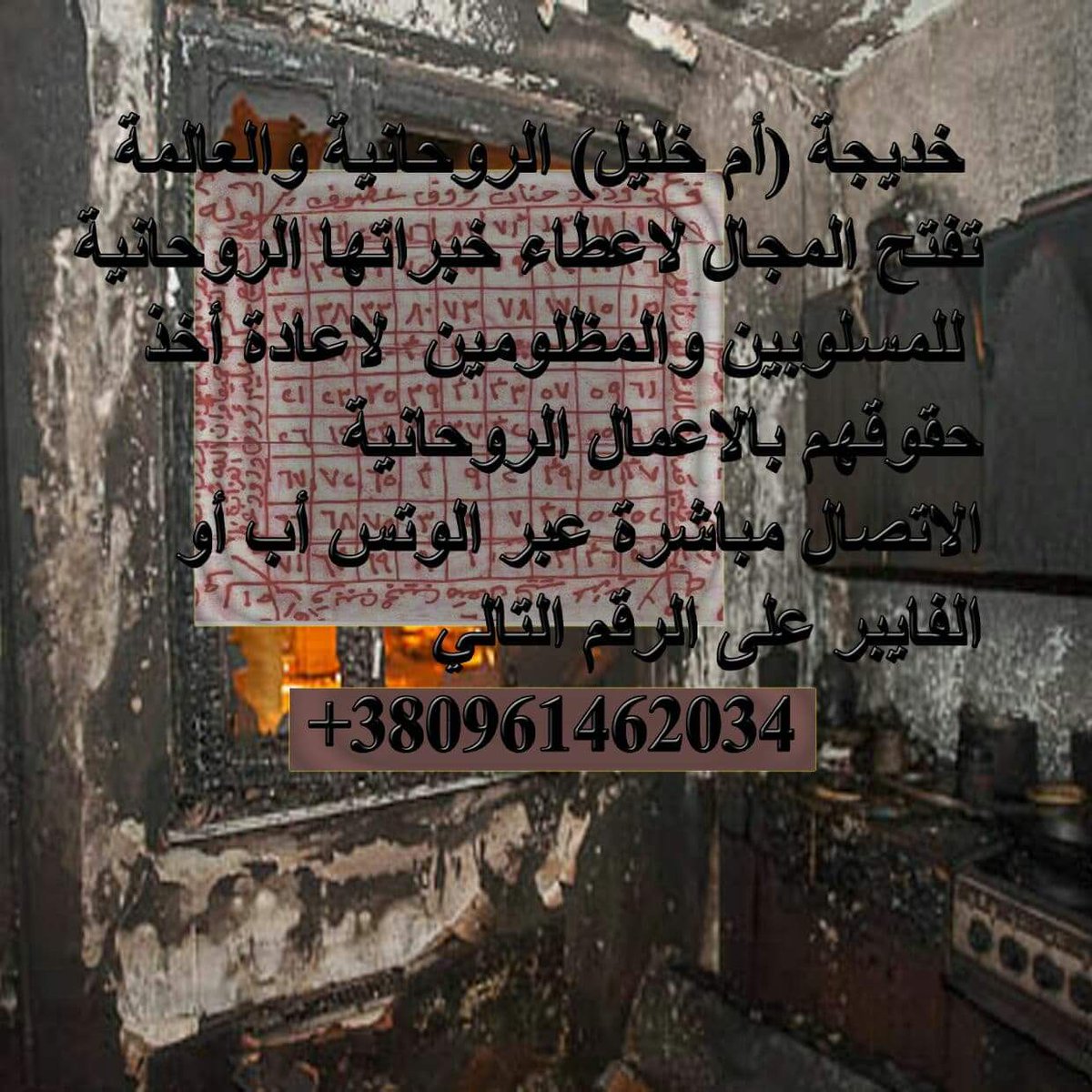 الشيخة الروحانية ام خليل تطلعكم على بعض الاعمال وهي: تعطيل أعمال السحره والاعمال الشيطانيه والتحصين منها مثل السحر والصرع والمس الشيطاني ، زواج البنت المتعسرة عن الزواج ، عدم زواج الزوج على زوجته في دفع الشدائد ، الحصانة من الظالمين... 00905356035593