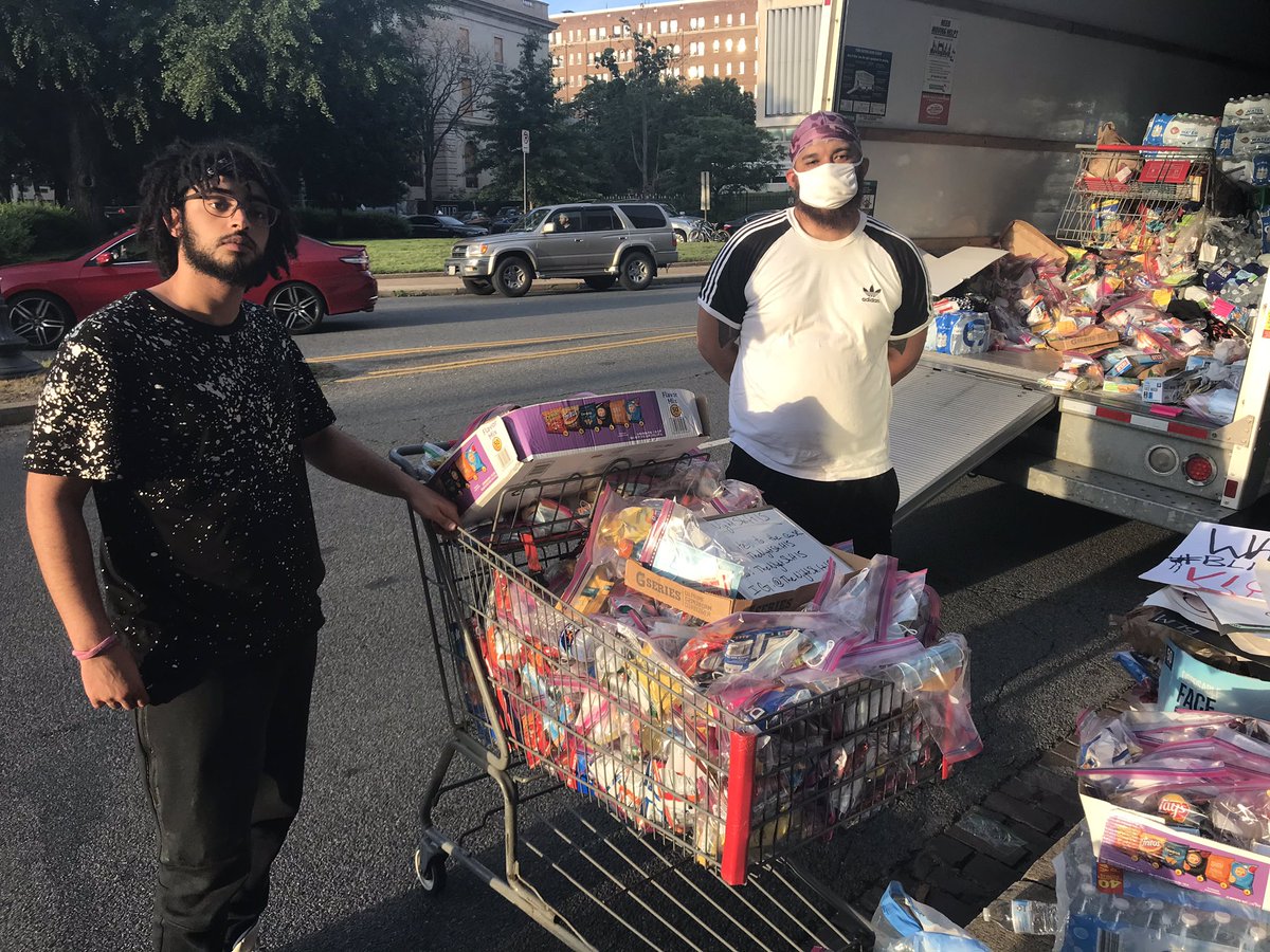 Joe Birmingham of Annandale and Kihsan Strother of Alexandria are part of "The Night Shift 15." The group pushes 🛒s full of snacks, water, masks, and first aid kits in the protest zones. The items, free of charge. "We want to spread wealth and health to everybody." - Strother