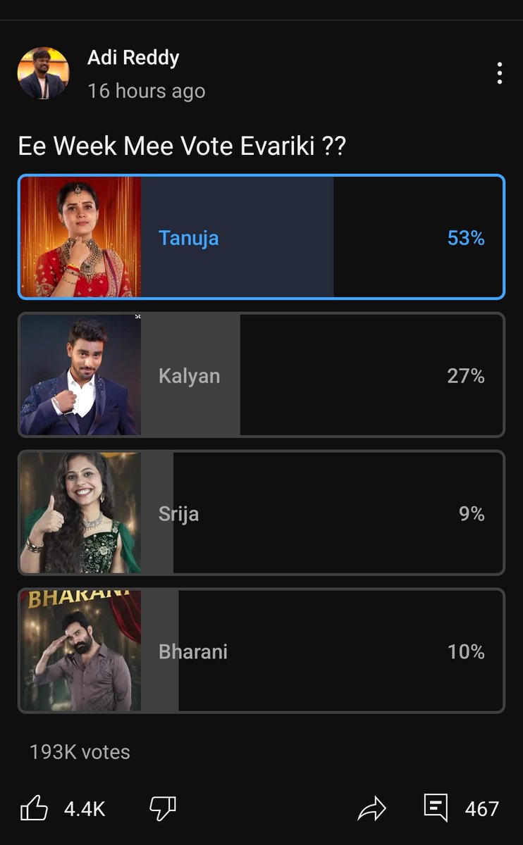 I'm away from social media and BiggBoss for a couple of days. After seeing this poll I couldn't control to post this 🤍 Vote for #Thanuja She is fearless, pure & more matured enough in the house #BiggBossTelugu9