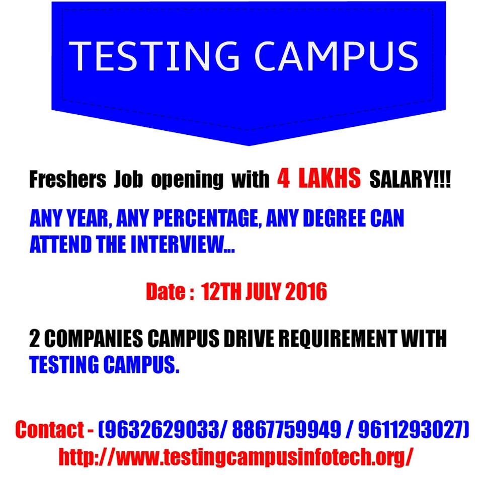 Freshers Job opening with 4 LAKHS SALARY!! 50+ JOB OPENINGS With #TESTING CAMPUS INFOTECH!! bit.ly/29BHrPz