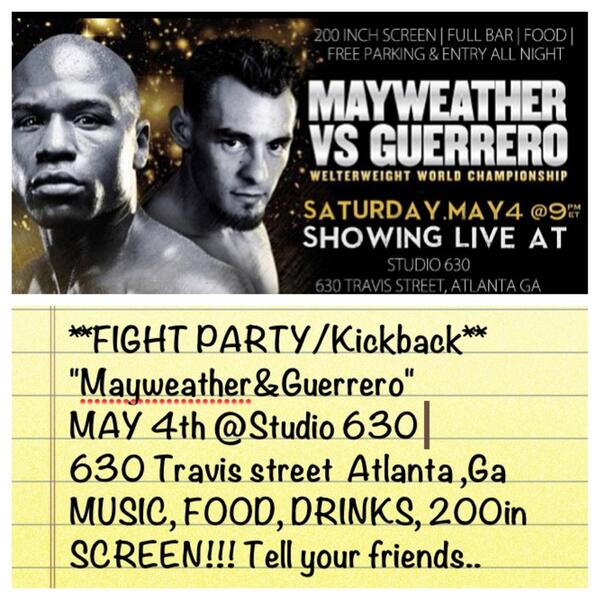 **FIGHT PARTY* Mayweather&Guerrero MAY 4th !!THIS SATURDAY!! 630 Travis street Atlanta ,Ga MUSIC FOOD DRINKS 200in SCREEN! @BIGDAWG_DJSTUD