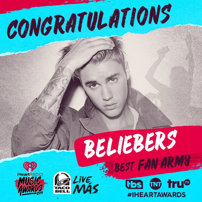 Congratulations to the #Beliebers on taking home the @tacobell #BestFanArmy Award at the #iHeartAwards.