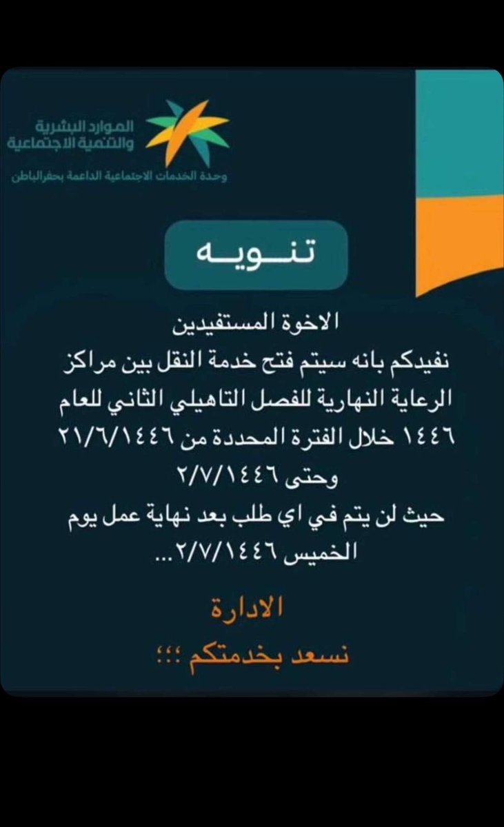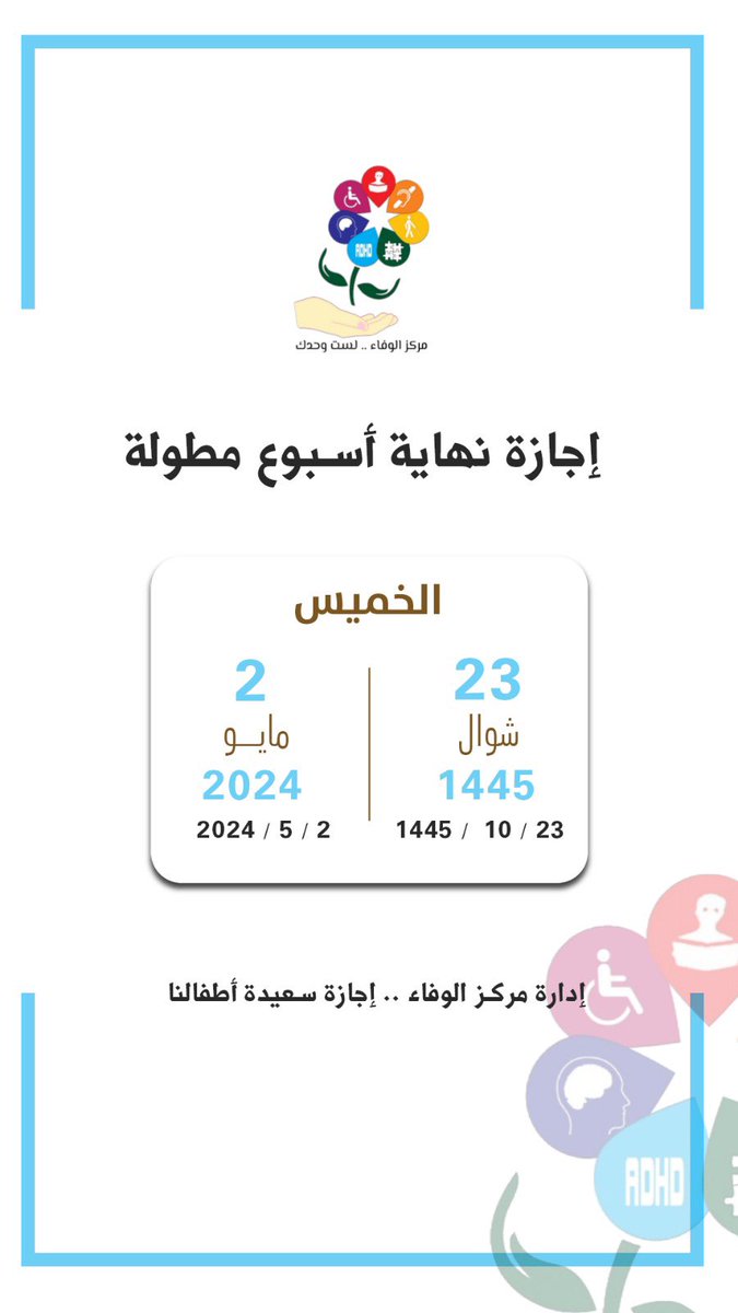 يعلن مركز الوفاء للرعاية النهارية للأشخاص ذوي الإعاقة عن موعد بدء العام التأهيلي لعام١٤٤٦ هـ وذلك يوم الأحد الموافق ٢١ / ٢ /١٤٤٦ هـ