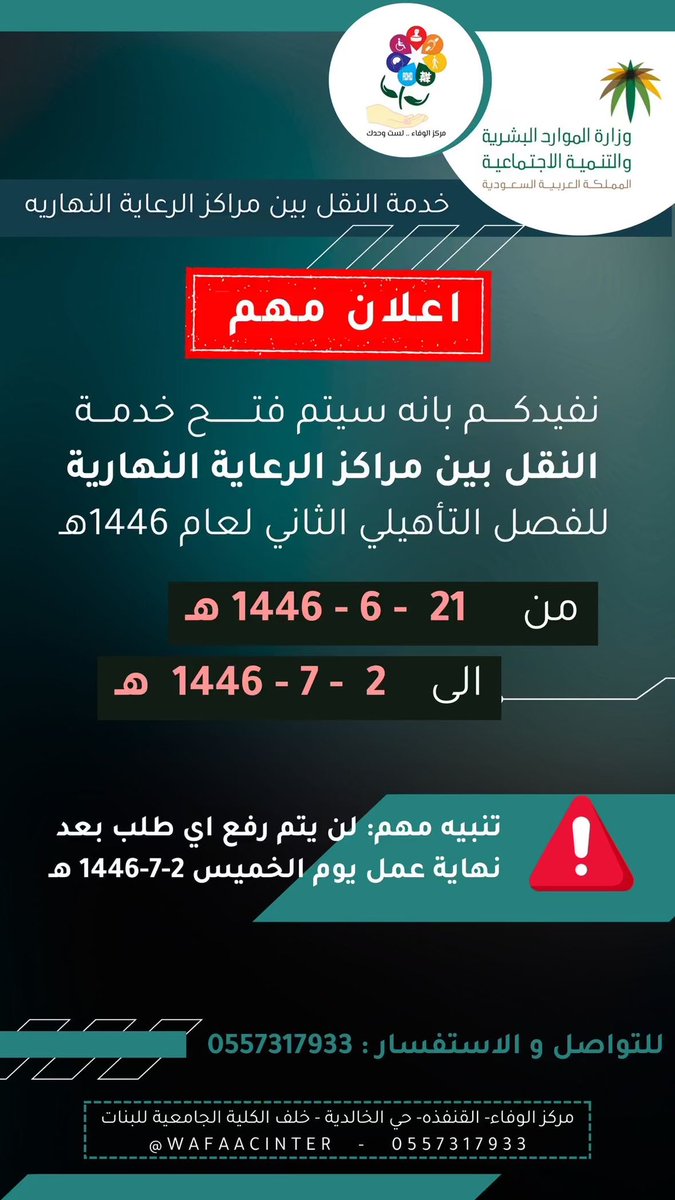 إعلان 📍 بدأ التسجيل في مركز الوفاء للرعاية النهارية للأشخاص ذوي الإعاقة وتمتد فترة التسجيل حتى تاريخ ٢٦/١/١٤٤٦ الموافق ١/٨/٢٠٢٤م.