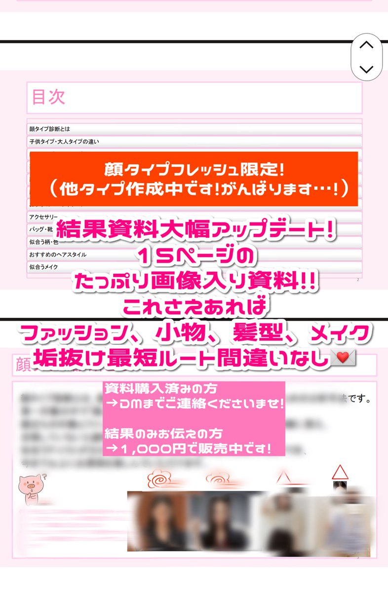 【顔タイプフレッシュ限定❗️❗️❗️】 結果資料を大幅アップデートいたしました! 資料購入済みのフレッシュの方は新しい資料をお渡しいたしますのでご連絡くださいませ♡ 未購入の方は1,000円でご購入いただけますのでお声がけくださいませ🎀 他のタイプ資料も作成中です!もう少々お待ちください🥲 https://t.co/SoUm7k68d6