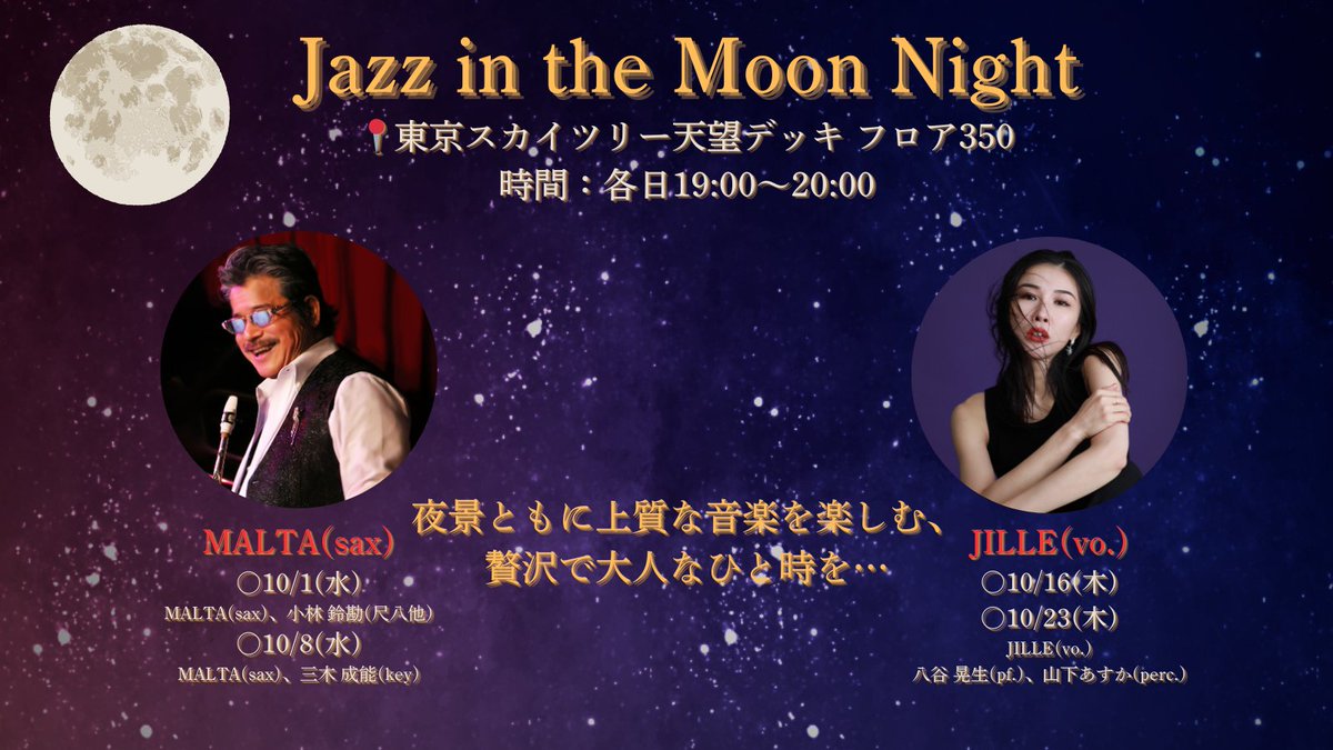 / 今年も開催🎶 Jazz in the Moon Night🌙 \ 上質な音楽とともに大人のための秋の夜長を… 10/1(水),10/8(水) MALTA 10/16(木),10/23(木) JILLE 時間:各日19:00~20:00 場所:天望デッキ フロア350 料金:観賞無料(展望台への入場料が必要です) 詳しくは👇 tokyo-skytree.jp/event/info/aut…