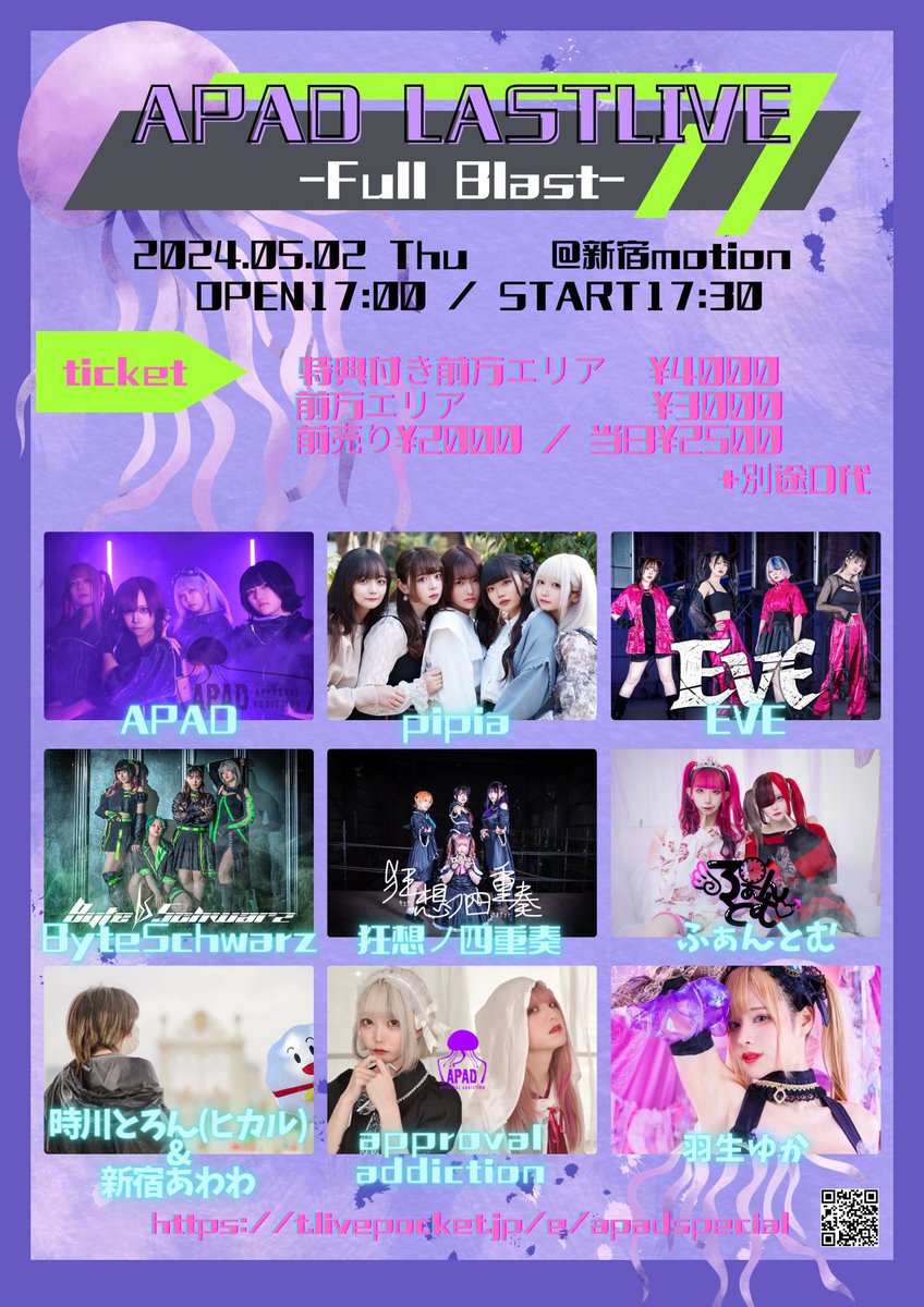 🪼フライヤー&タイムテーブル解禁🪼 『 APAD LASTLIVE -Full Blast- 』 2024.5.2 📍新宿motion OPEN17:00/START17:30 特典付き前方エリア¥4000/前方エリア¥3000/前売り¥2000/当日¥2500 D別 特典はAPADメンバー全員からメッセージ入り色紙です🪼 🎫チケット予約はこちら t.livepocket.jp/e/apadspecial