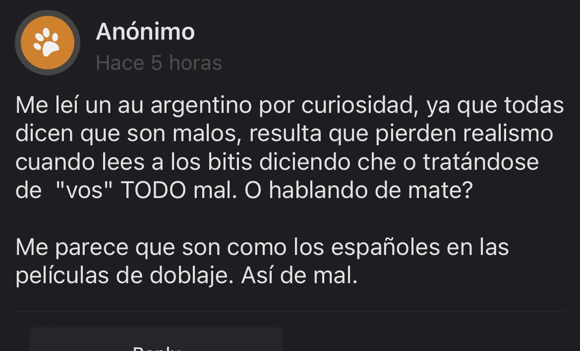 y nosotros teniamos q soportar tener que leer en wattpad todo neutro agradezco no tener q volver a leer refrigerador ni chamarra de mezclilla o fresa